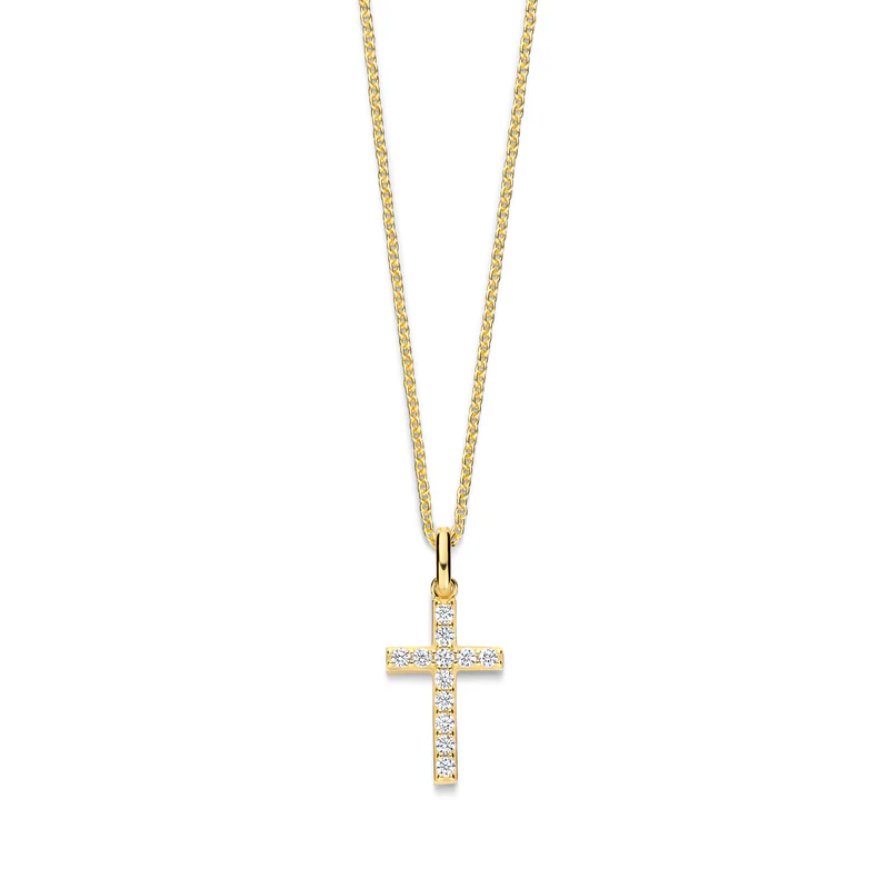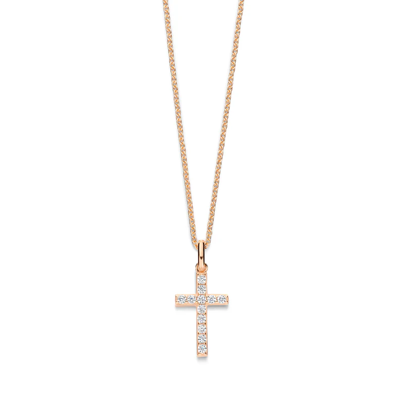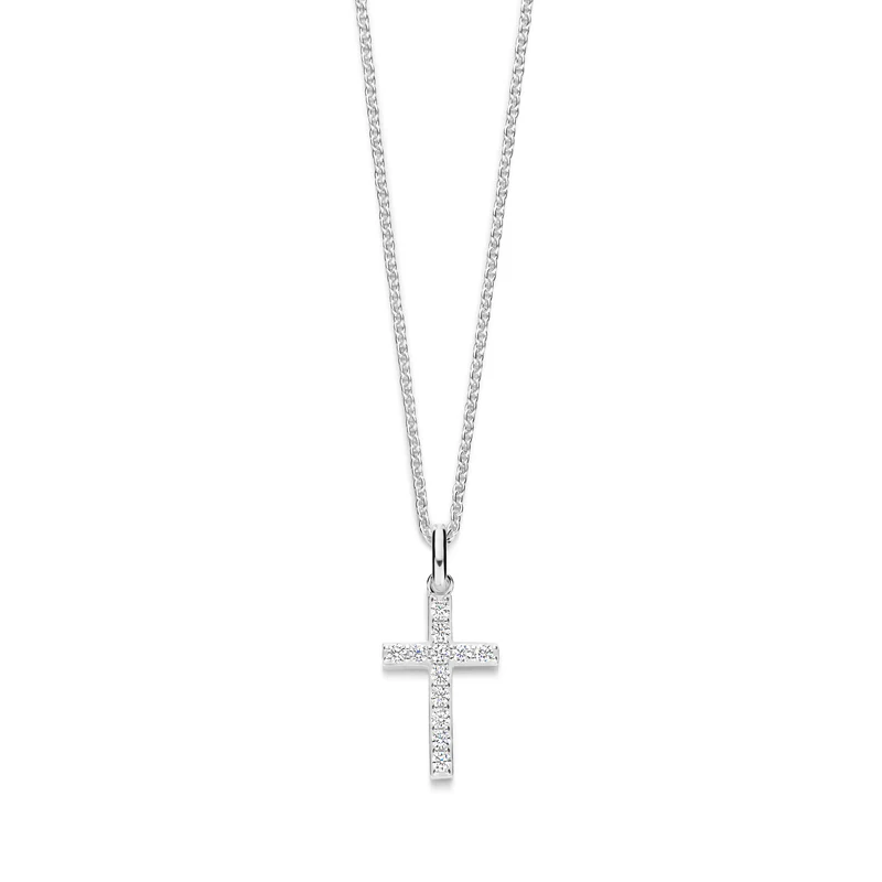 Der schöne, klassische Kreuzanhänger, der mit funkelnden Zirkoniasteinen besetzt ist, die ihm einen eleganten und strahlenden Look verleihen. Tragen Sie ein Symbol des Glaubens und der Stärke nah an Ihrem Herzen - ein Schmuckstück, das Sie täglich an Ihre Werte und Ihren inneren Frieden erinnert.